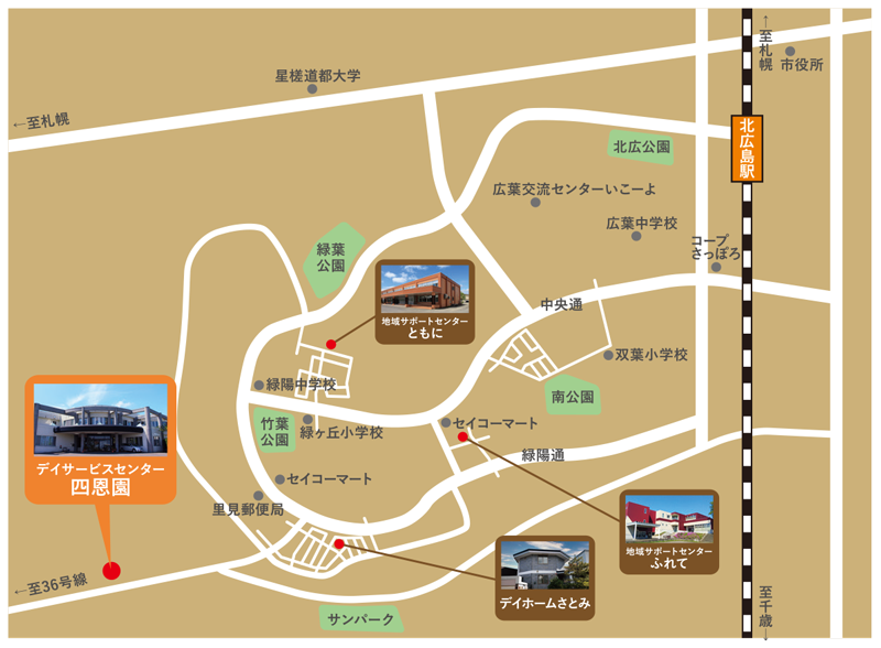 | 北広島デイサービスセンター四恩園 | デイサービス 入浴・食事・機能訓練 送迎 重度介護 |