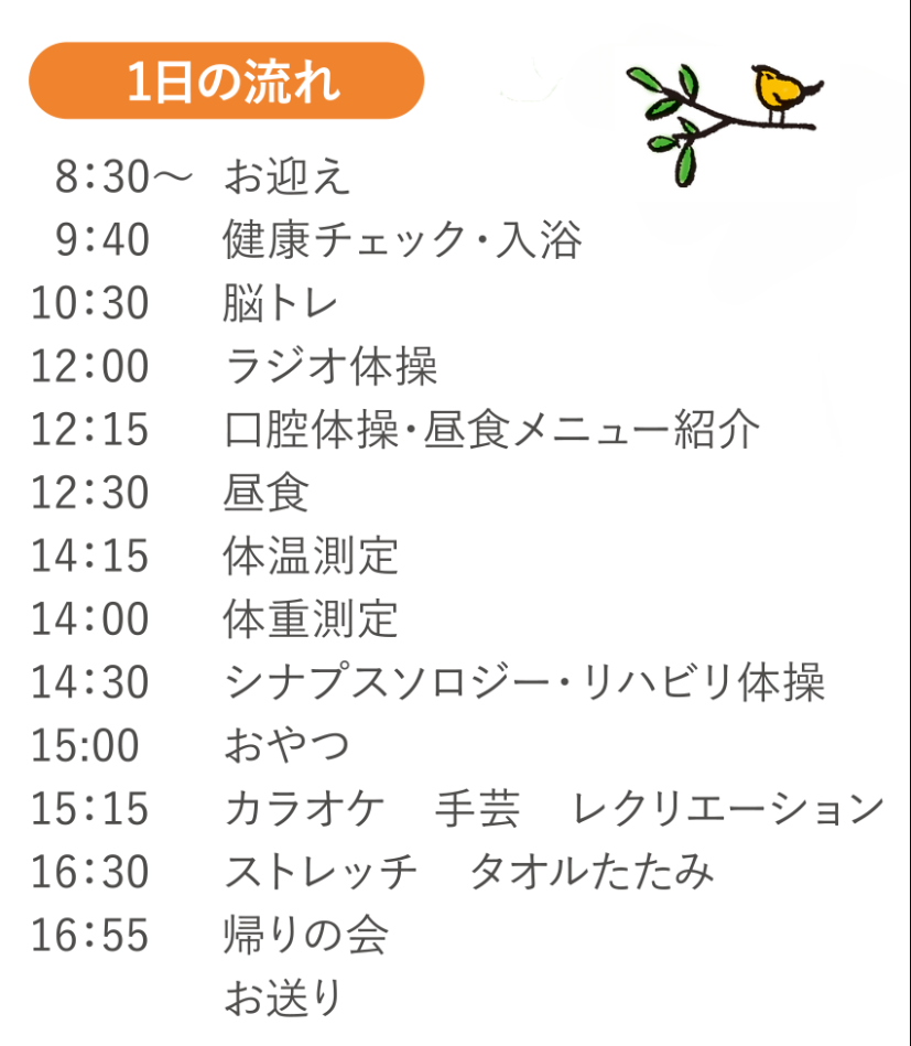 | ●営業日・・・月曜日~土曜日 ●サービス提供時間・・・9:40~16:55 休業日は日曜日のみ(年末年始、祝祭日、お盆も営業 |