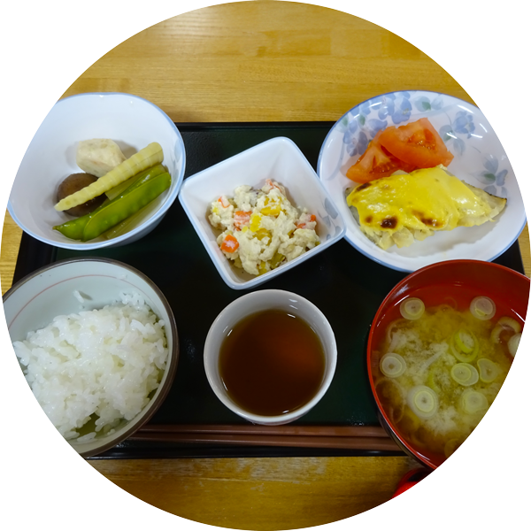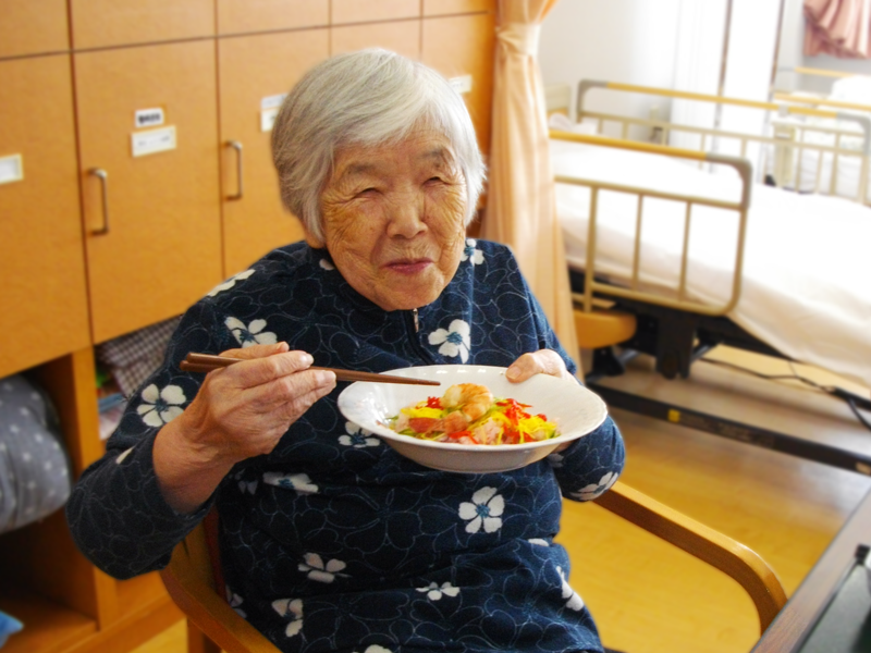 お食事は管理栄養士の立てたバランスの良いメニューにて提供。施設厨房で調理した出来立ての食事はおいしいと大好評。ご飯やお味噌汁はフロア内のキッチンで料理・配膳します。お食事の香りや音の刺激、おいしく食べることで、お客様の生きる力を引き出します。
