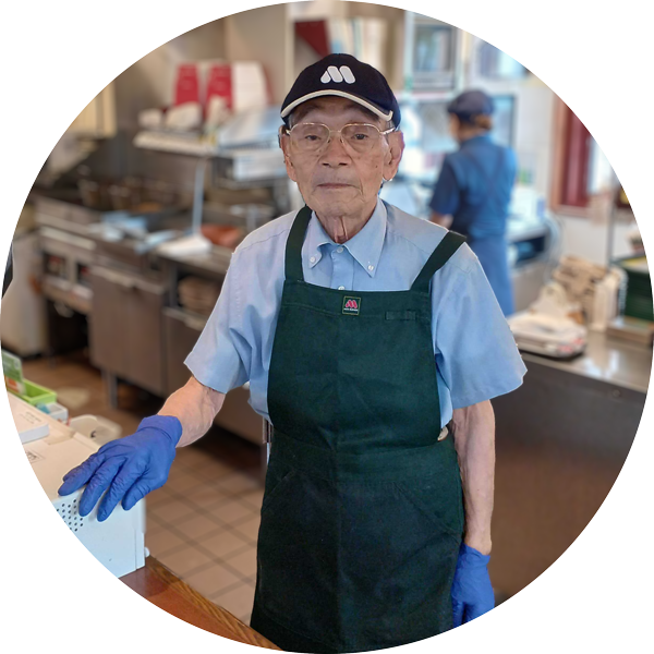 56歳から夫婦でハンバーガー屋を開店。83歳でも現役でしたが、脚立から転落し大けがを。退院後、リハビリを頑張り、なんと復職することができました。さすがに体調は万全ではないけれど、仕事をしていないともっと動けなくなってしまう。来てくれるお客様のためにもできる限り店に出続け、日本一になりたい。